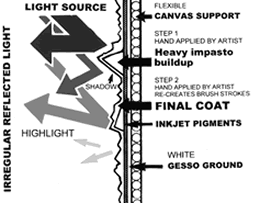 This step, done by Michael, requires individual attention to each Giclee. First, a transparent paste is specially applied to add three-dimensional edges with tools that bring out the natural "impasto" effect occurring on the surface of the original art. When the first layer is dry, a second coat of slightly thinner transparent gets applied over the entire canvas,,using a stiff brush that leaves both a permanent and unique |